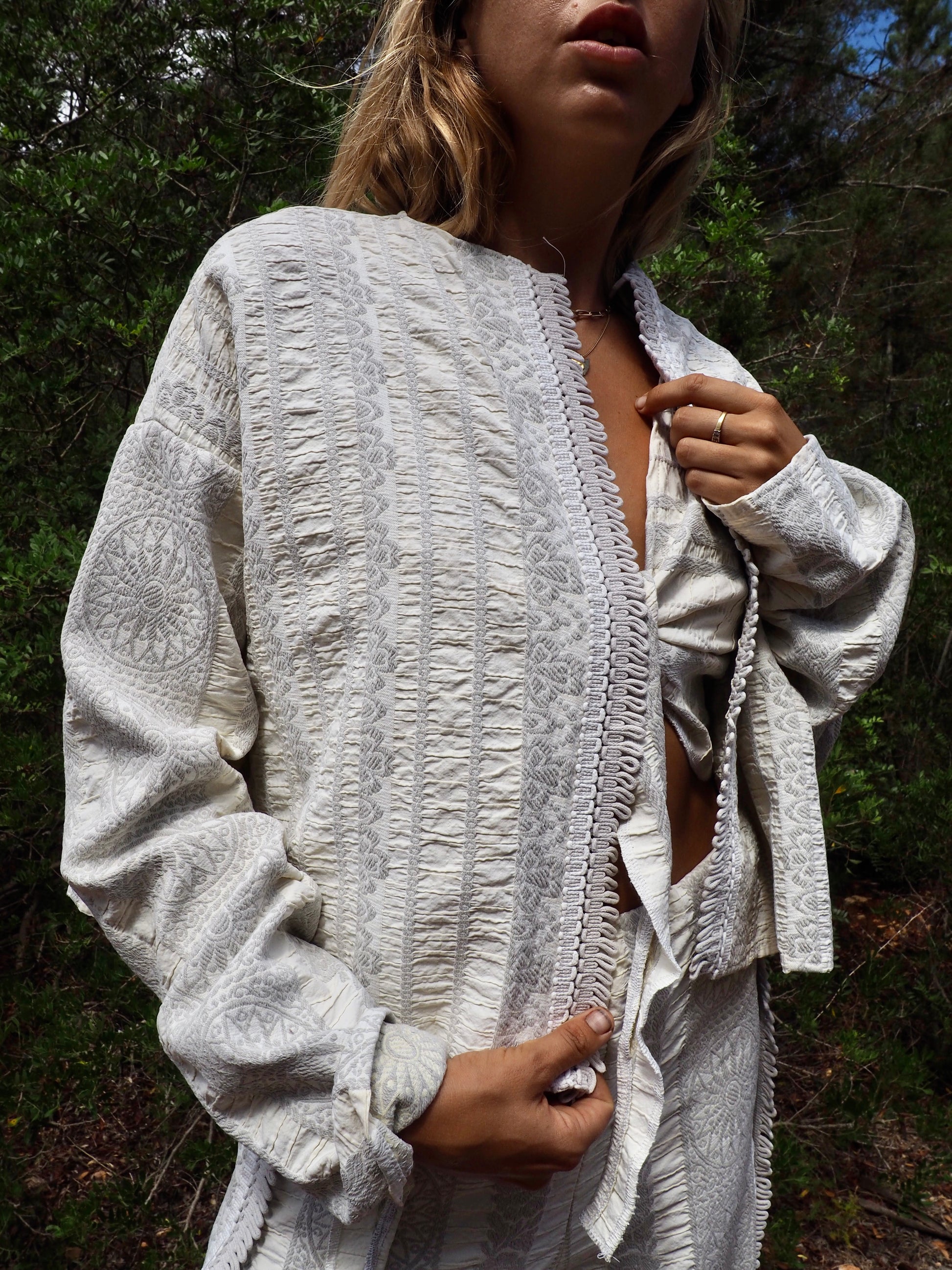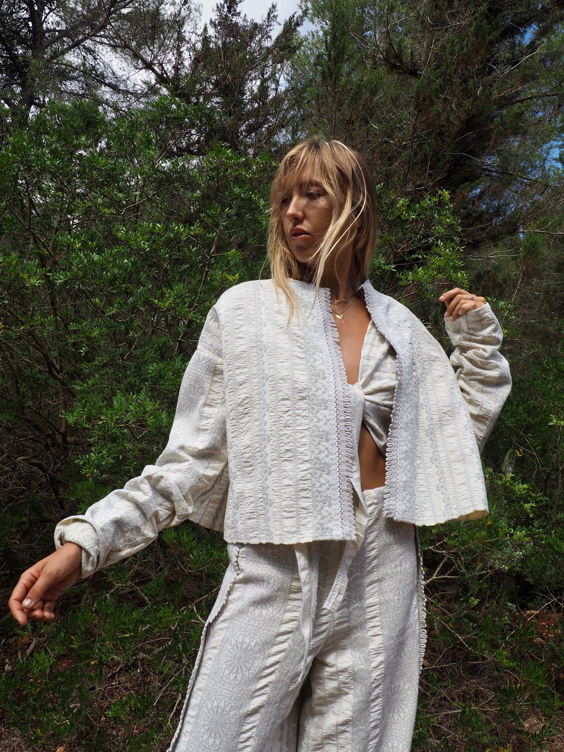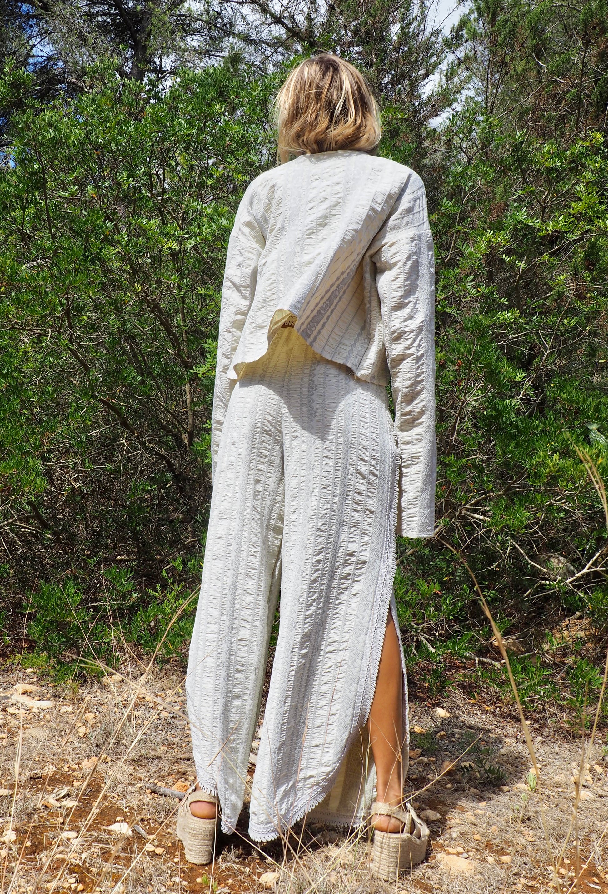 Up-cycled heavy cream and gray cotton woven textile cropped jacket with super cool oversize long sleeves can be worn long as a statement or gatherd/turned up very nice quality a high end woven with details strips of woven patterned floral design made by Vagabond Ibiza in our Atalier from recycled textiles listing is for the jacket only also have matching wide leg pants and reversible crop top available in other listings.