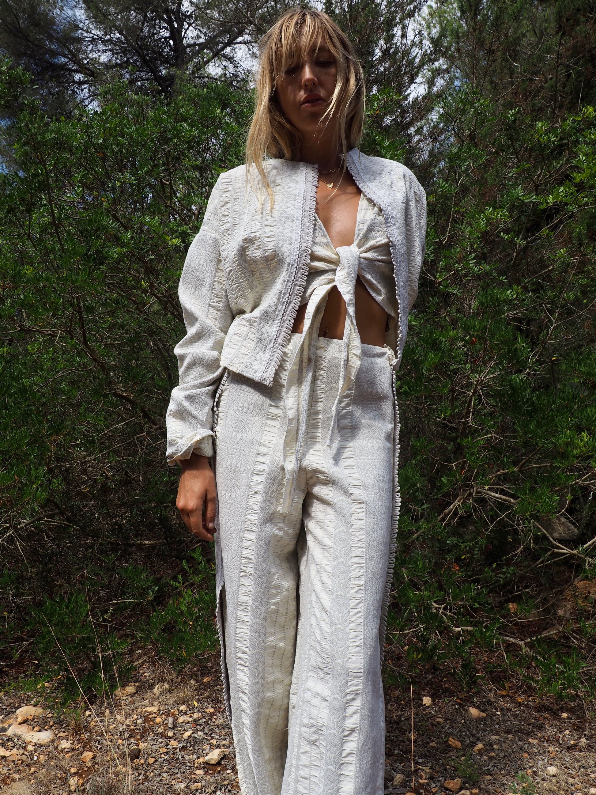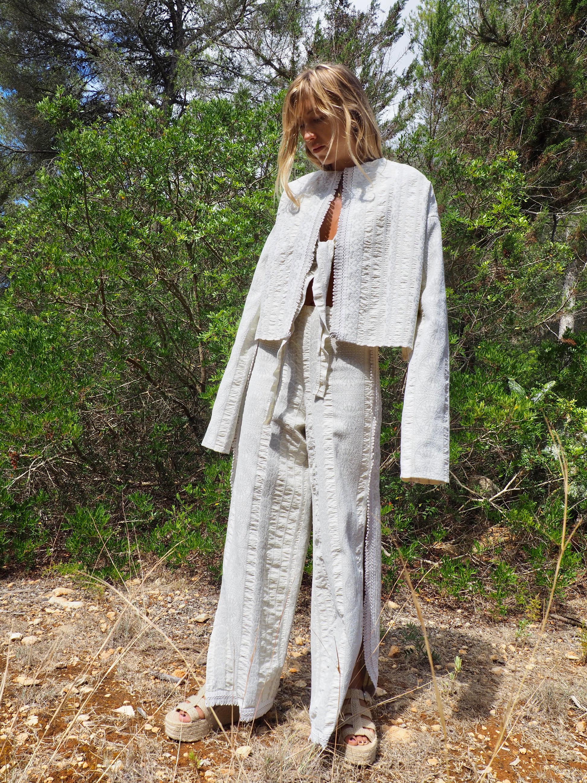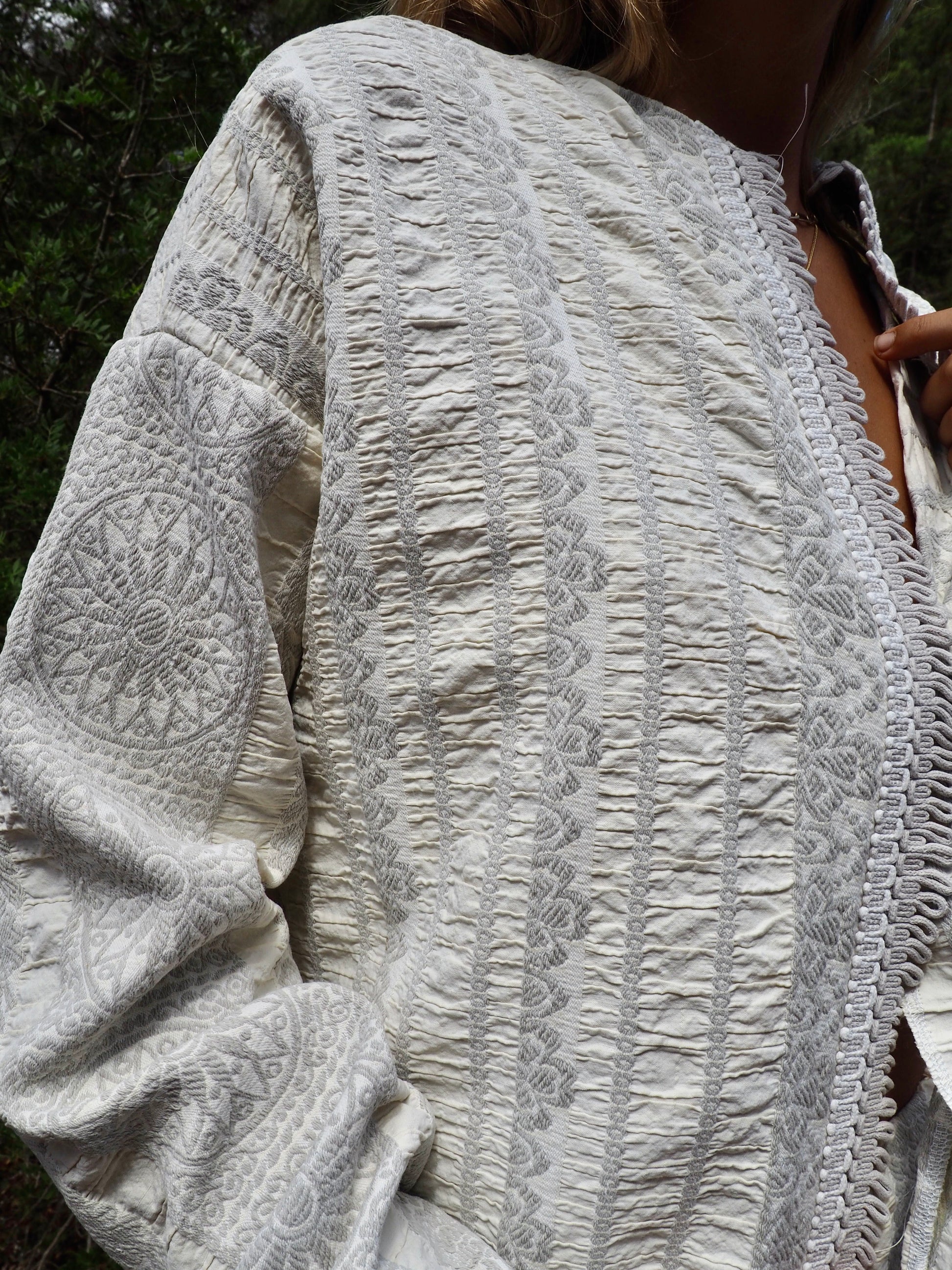 Up-cycled heavy cream and gray cotton woven textile cropped jacket with super cool oversize long sleeves can be worn long as a statement or gatherd/turned up very nice quality a high end woven with details strips of woven patterned floral design made by Vagabond Ibiza in our Atalier from recycled textiles listing is for the jacket only also have matching wide leg pants and reversible crop top available in other listings.