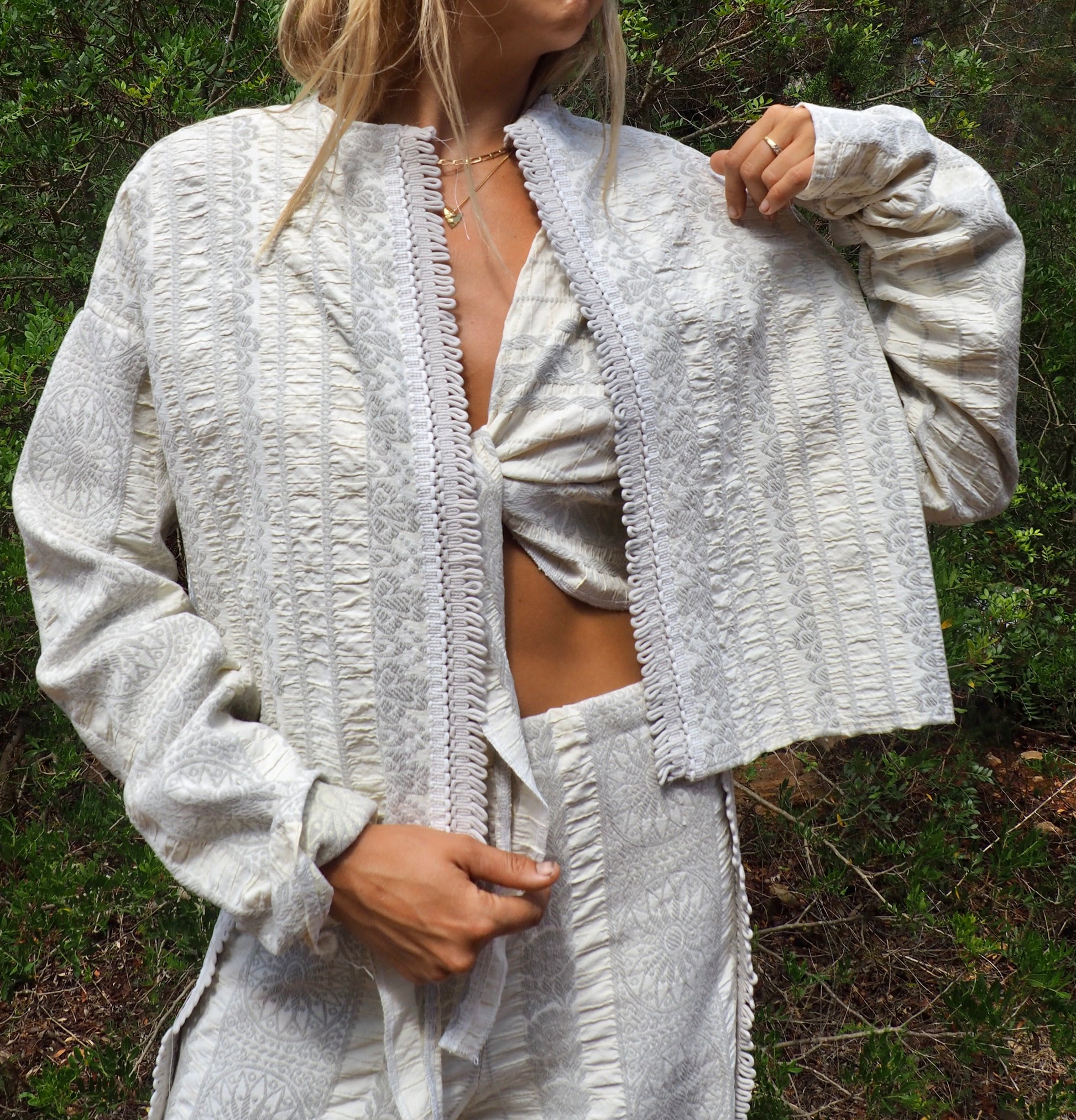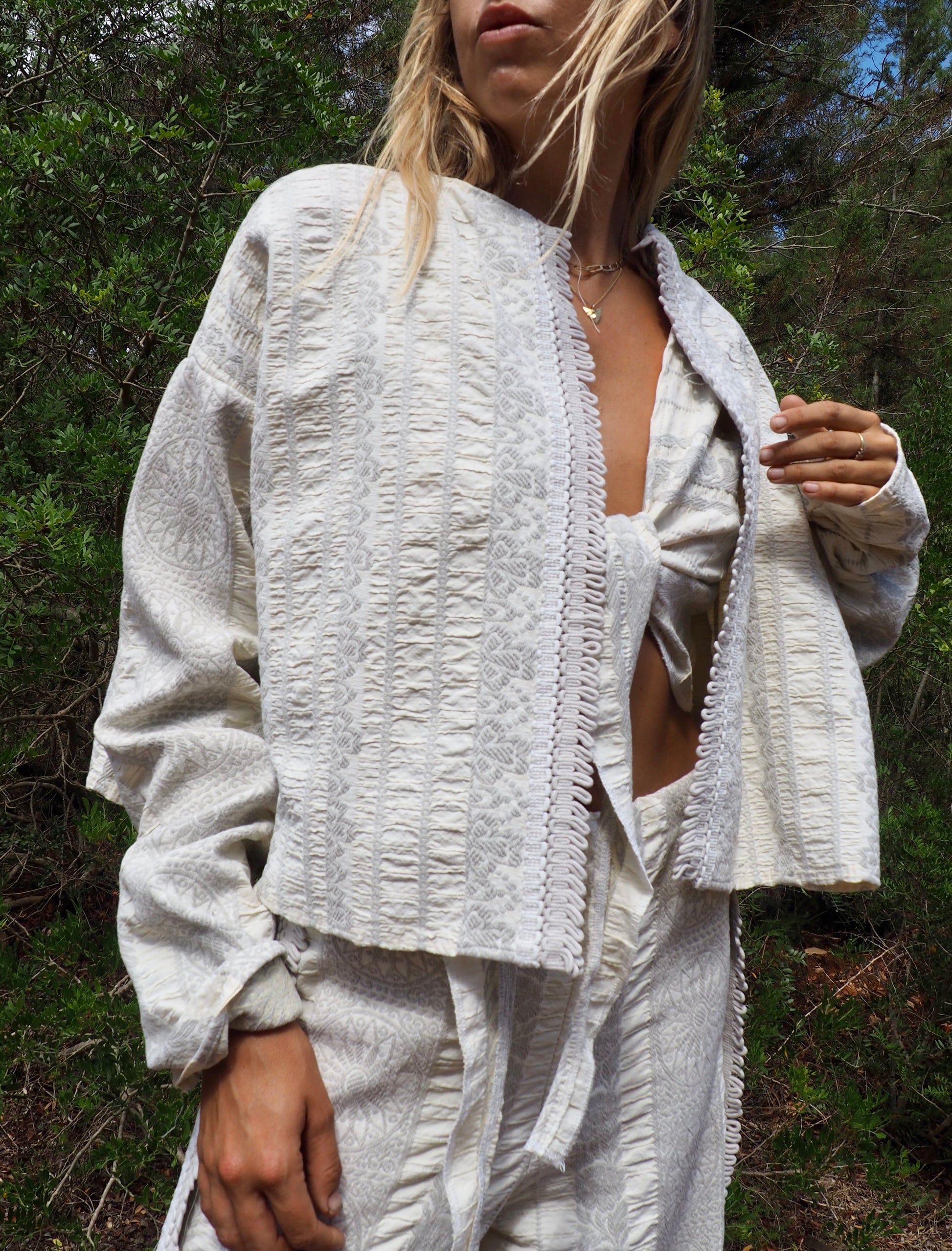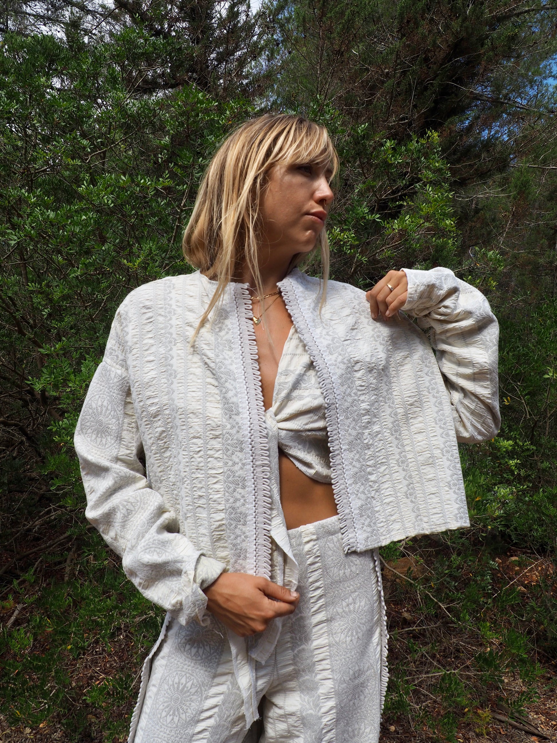 Up-cycled heavy cotton woven textile cropped jacket with super cool oversize long sleeves can be worn long as a statement made by Vagabond Ibiza