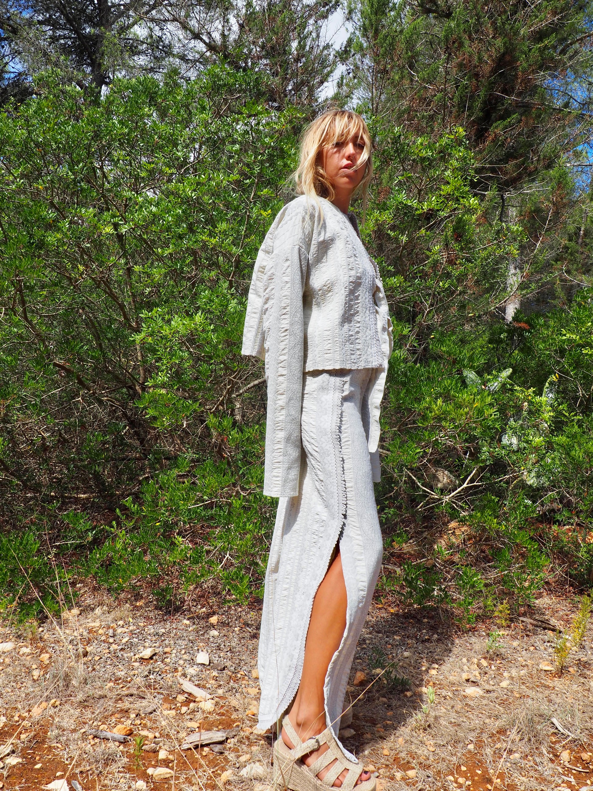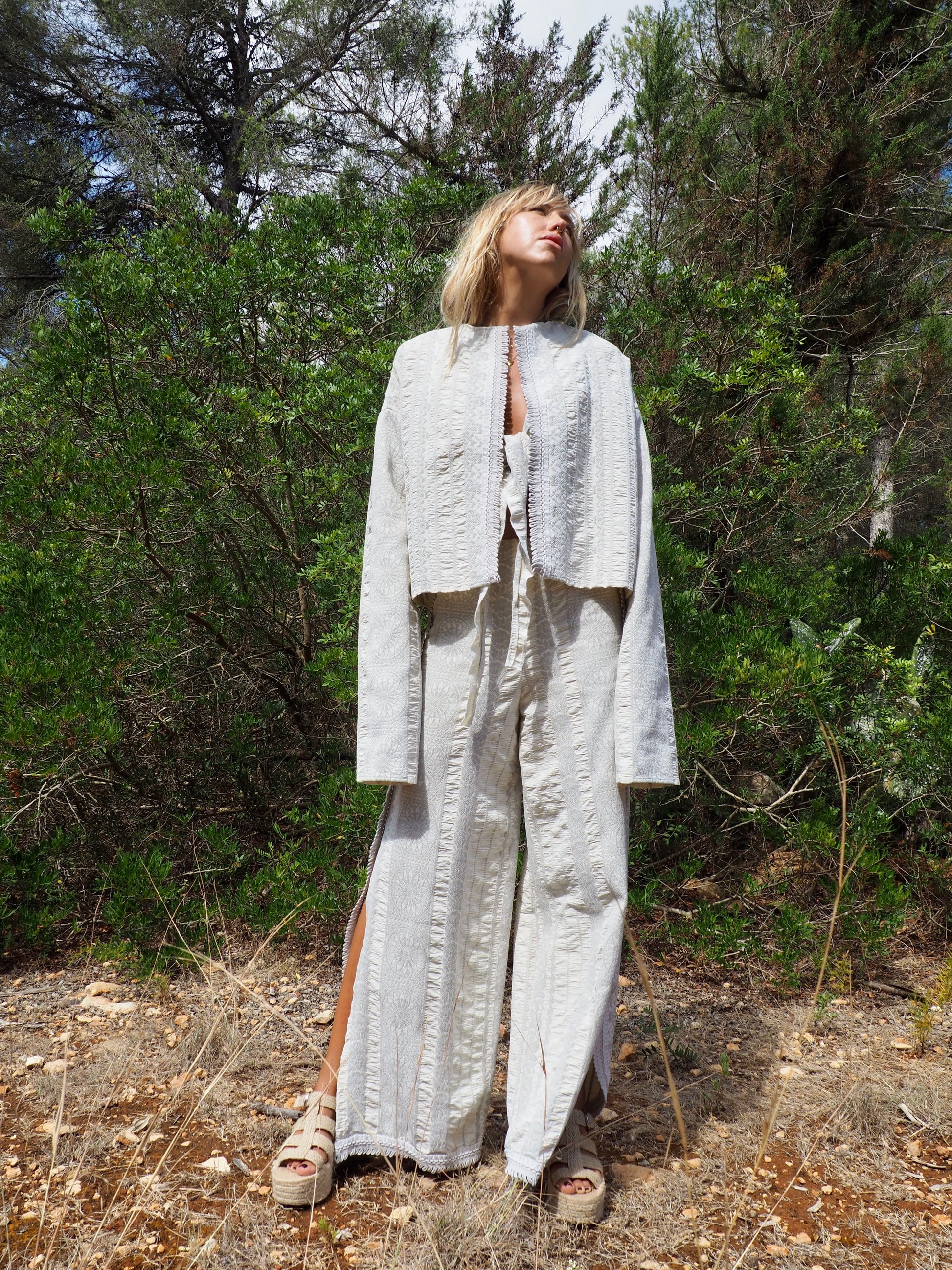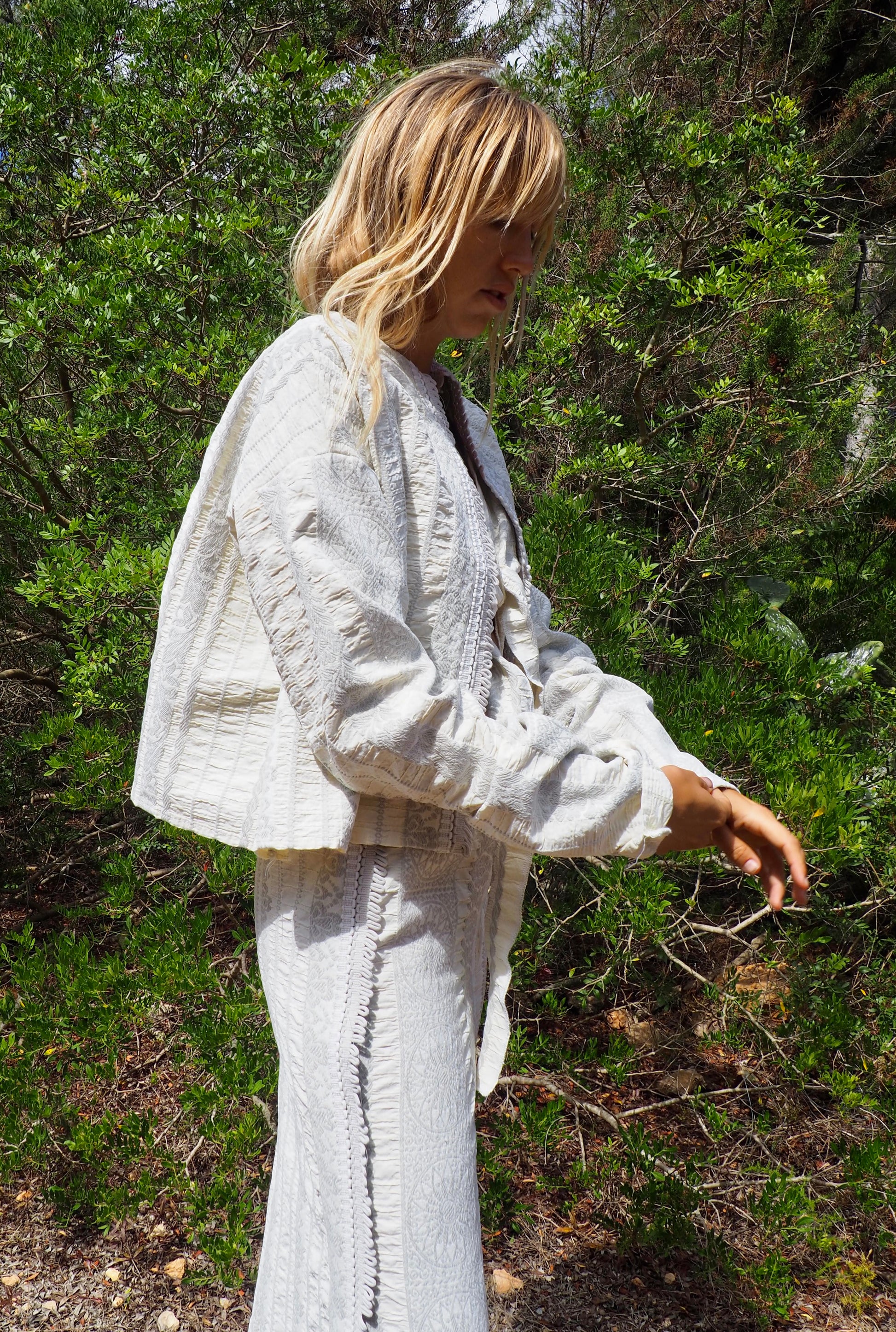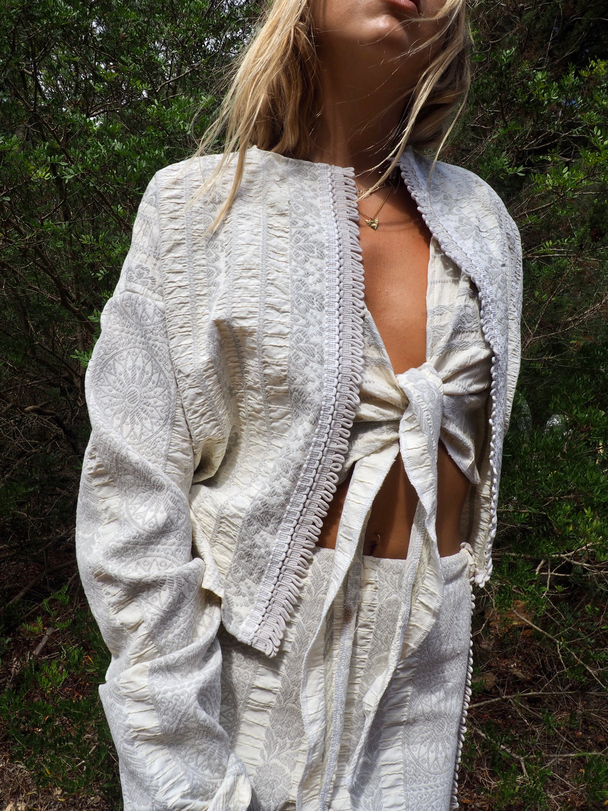 Up-cycled heavy cotton woven textile cropped jacket with super cool oversize long sleeves can be worn long as a statement made by Vagabond Ibiza