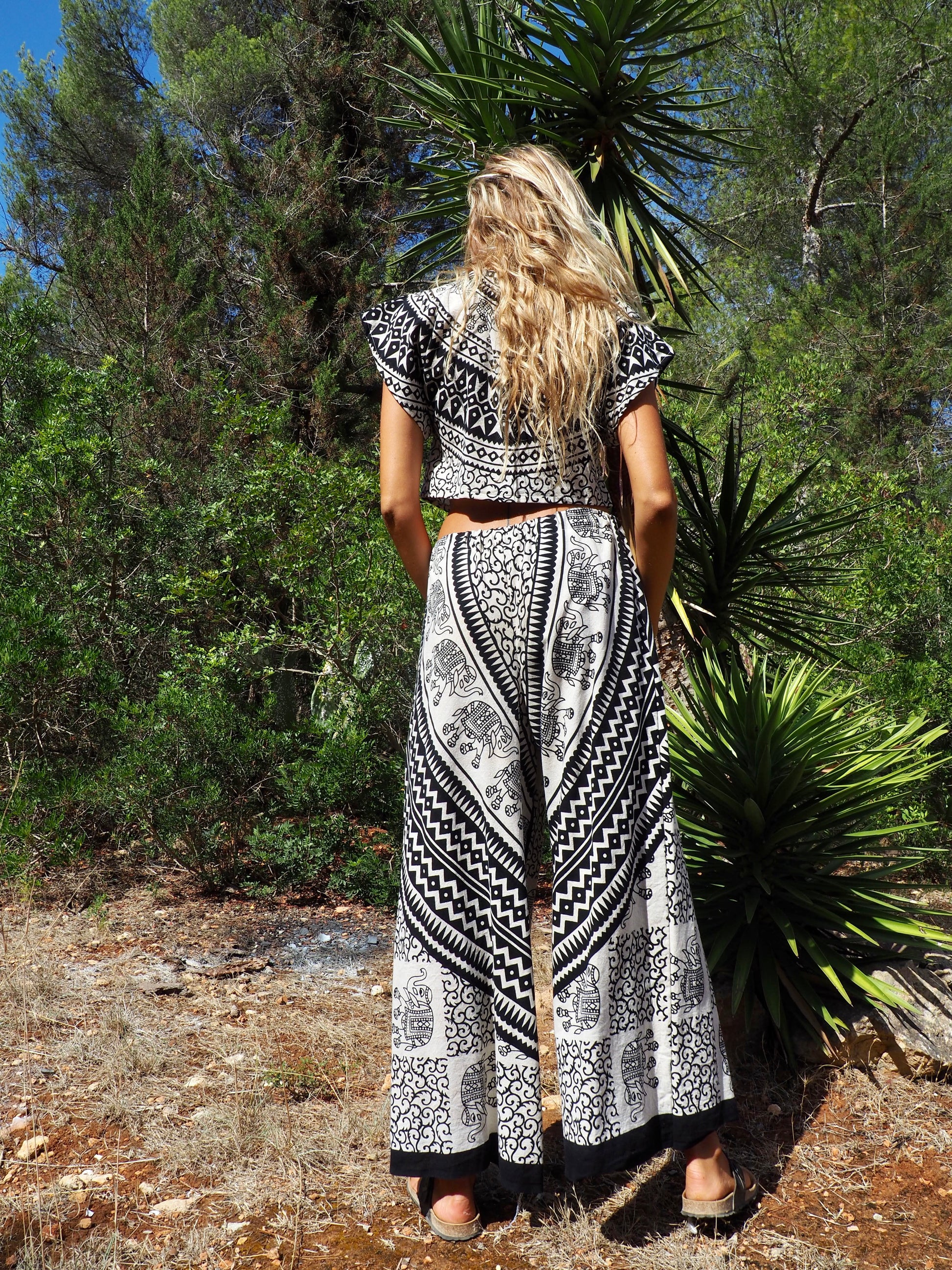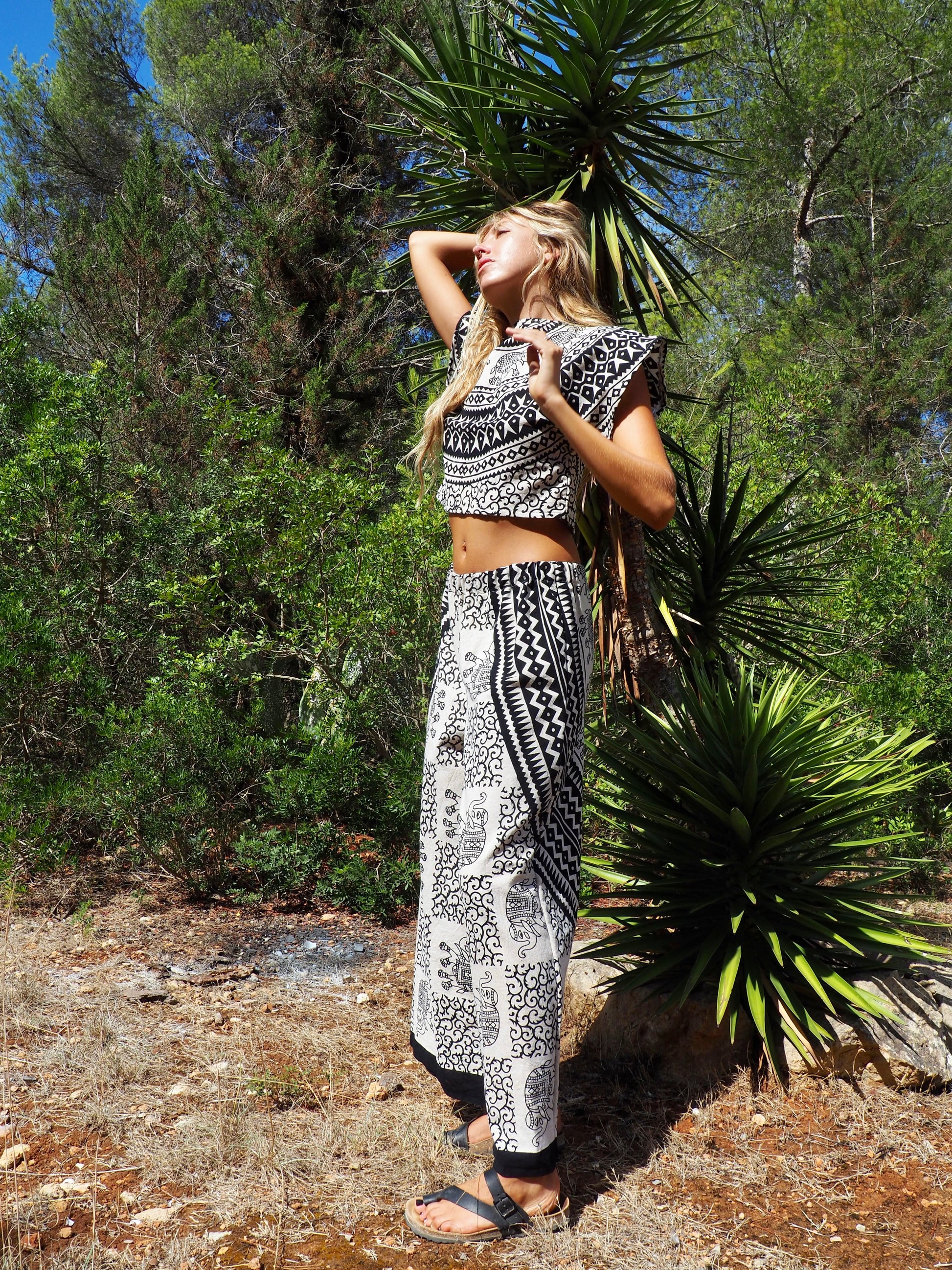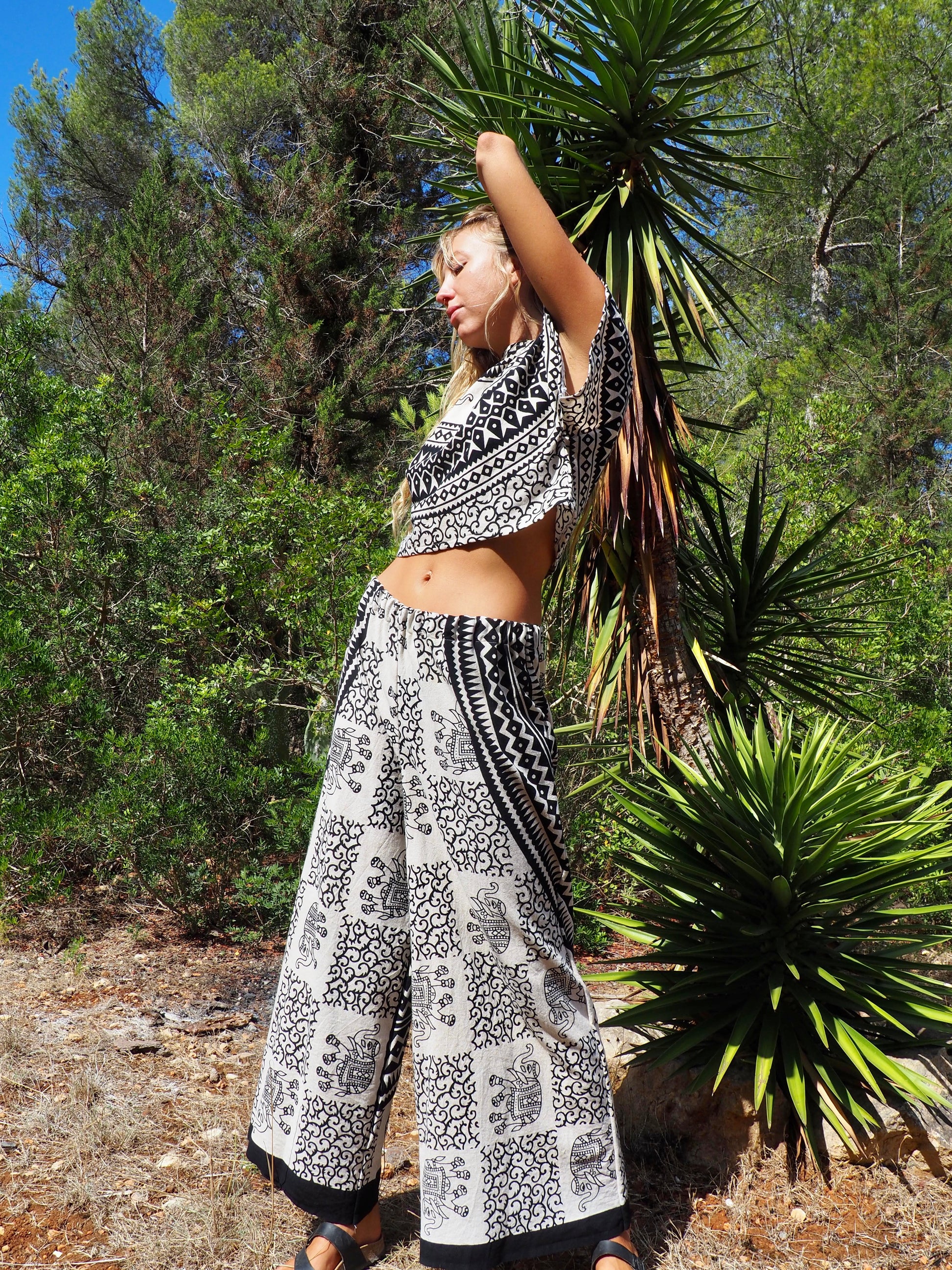 Up-cycled cotton black and cream printed wide leg pants by Vagabond Ibiza