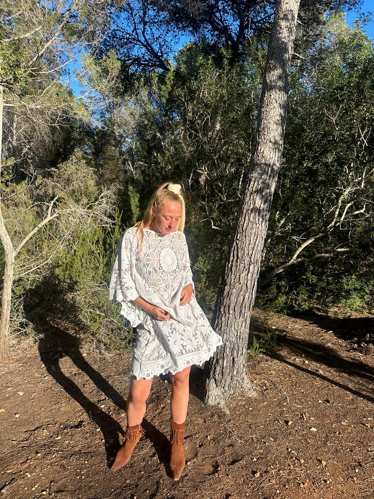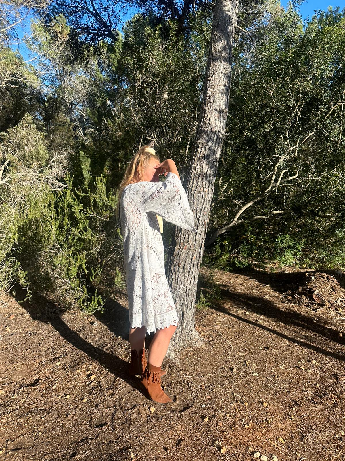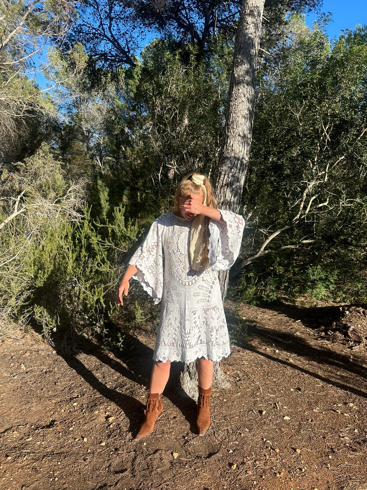 White vintage lace upcycled bell sleeve dress made by Vagabond Ibiza made in Ibiza lace work with beautiful pattern perfect ibiza dress