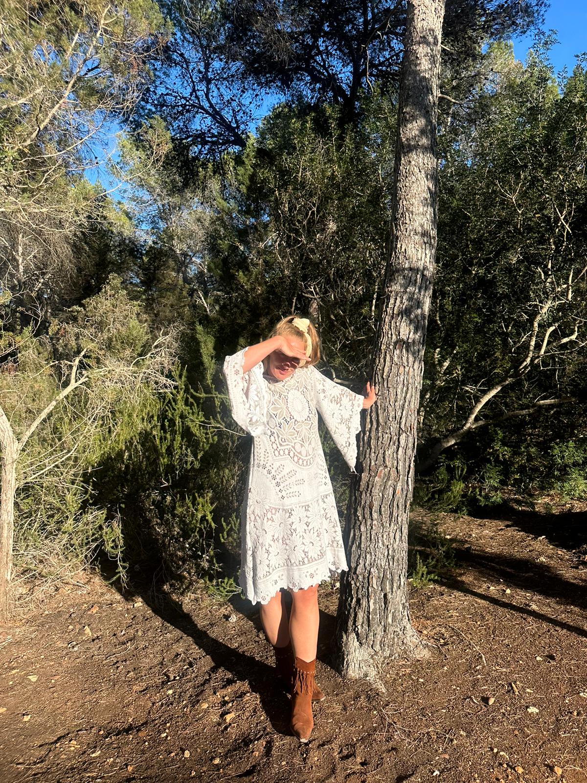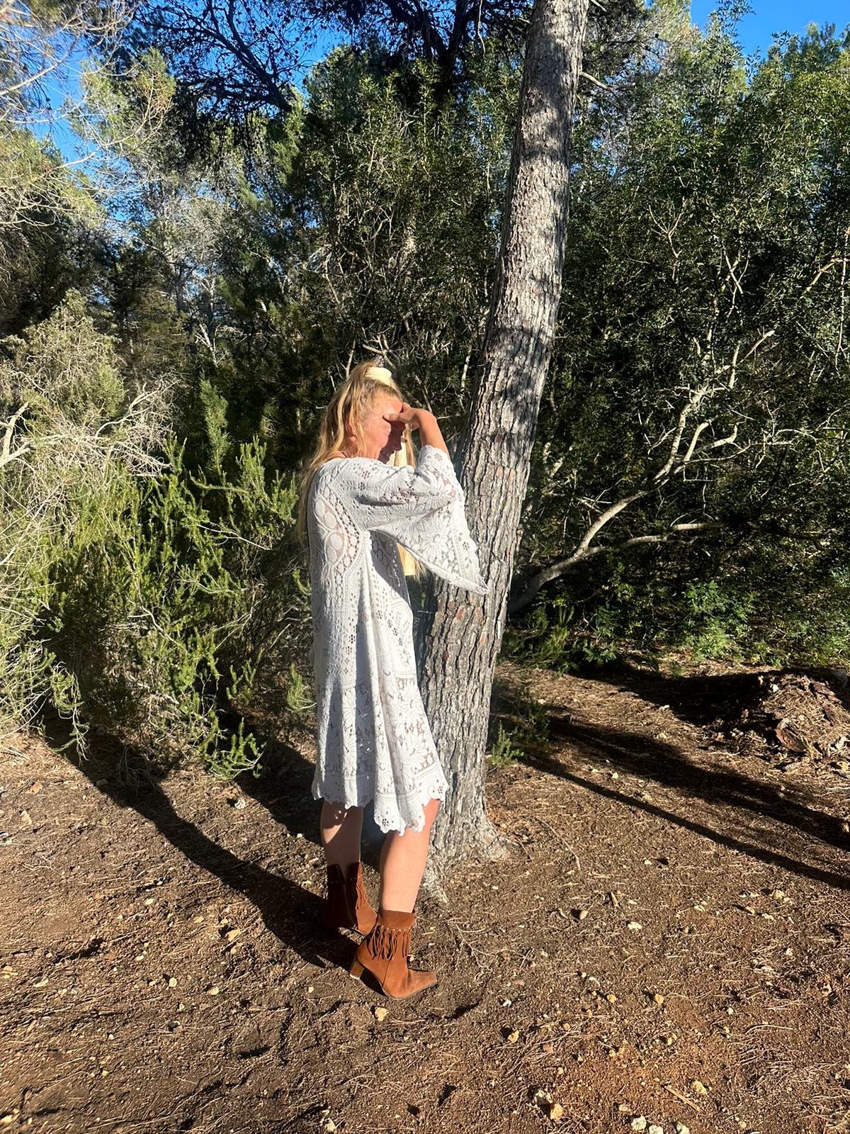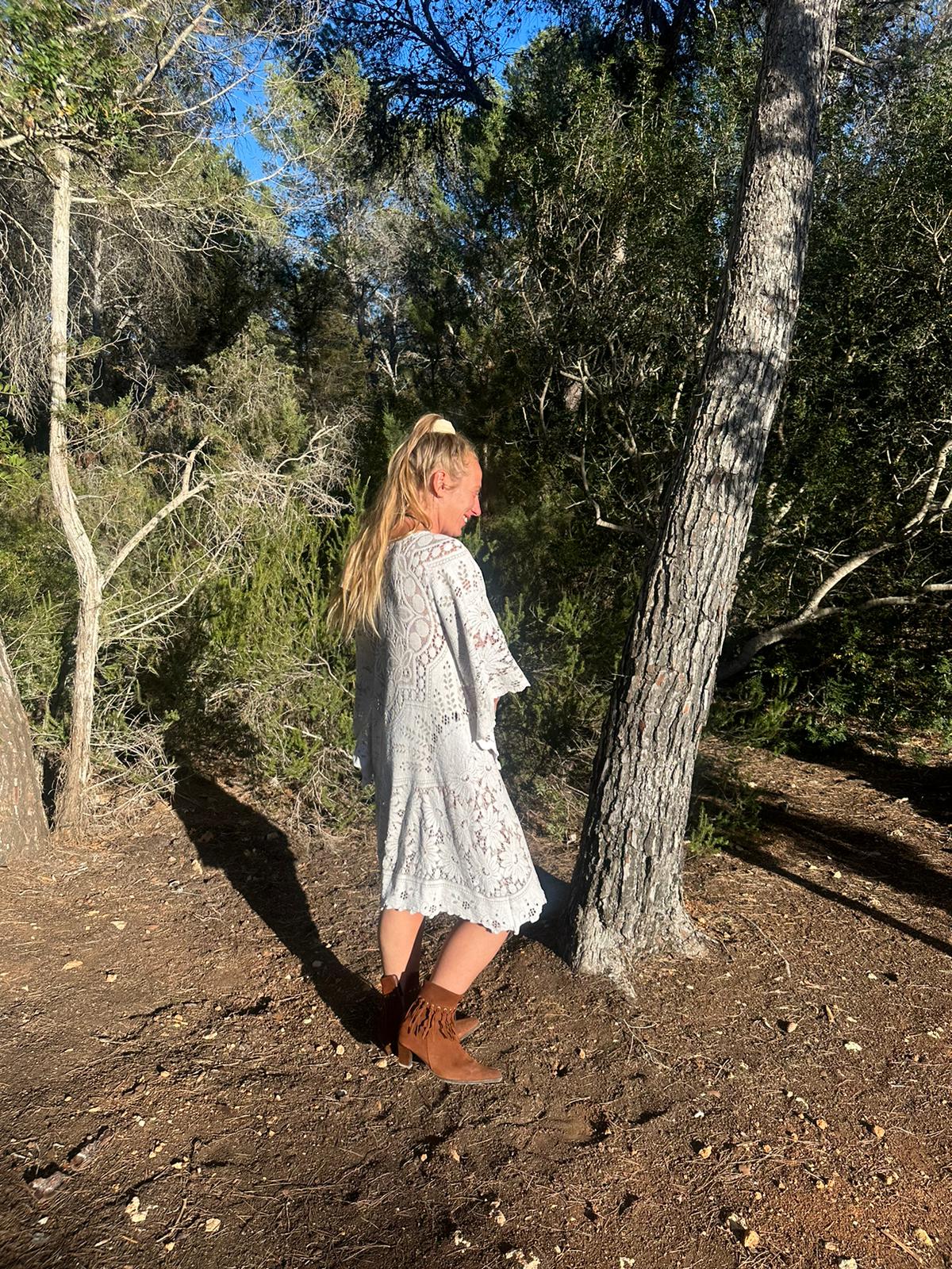 White vintage lace upcycled bell sleeve dress made by Vagabond Ibiza made in Ibiza lace work with beautiful pattern perfect ibiza dress