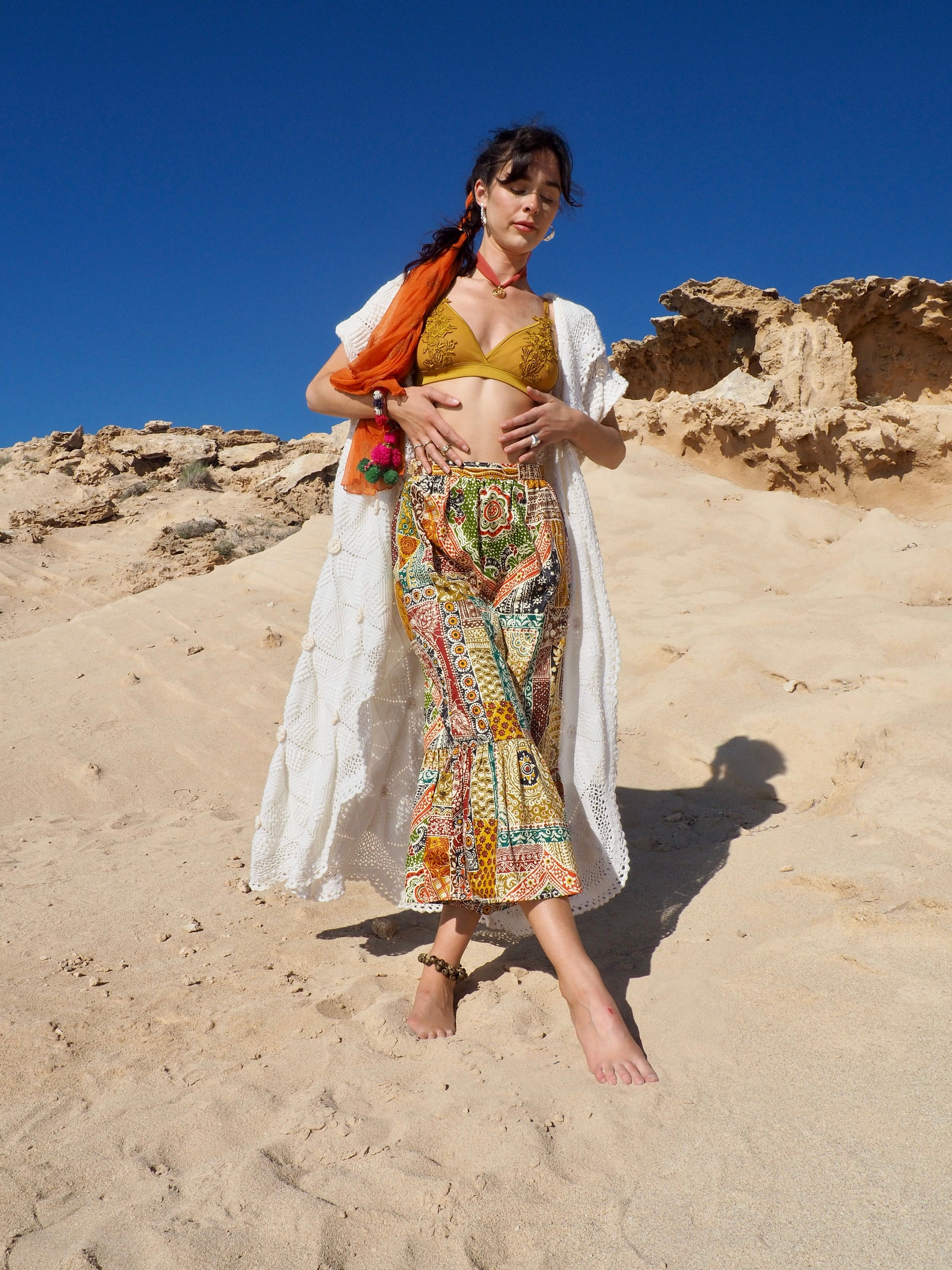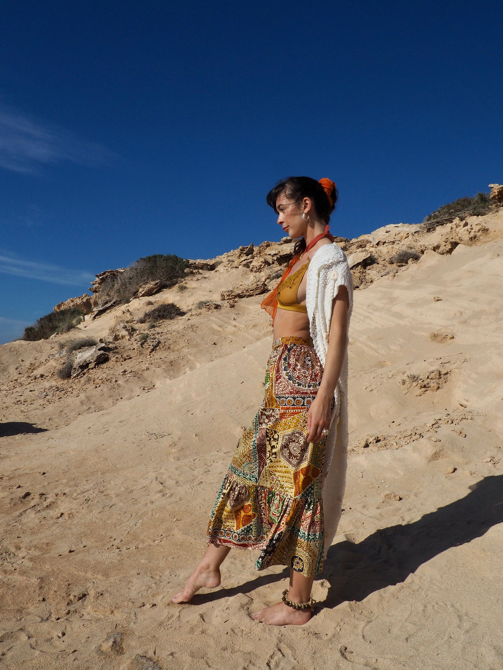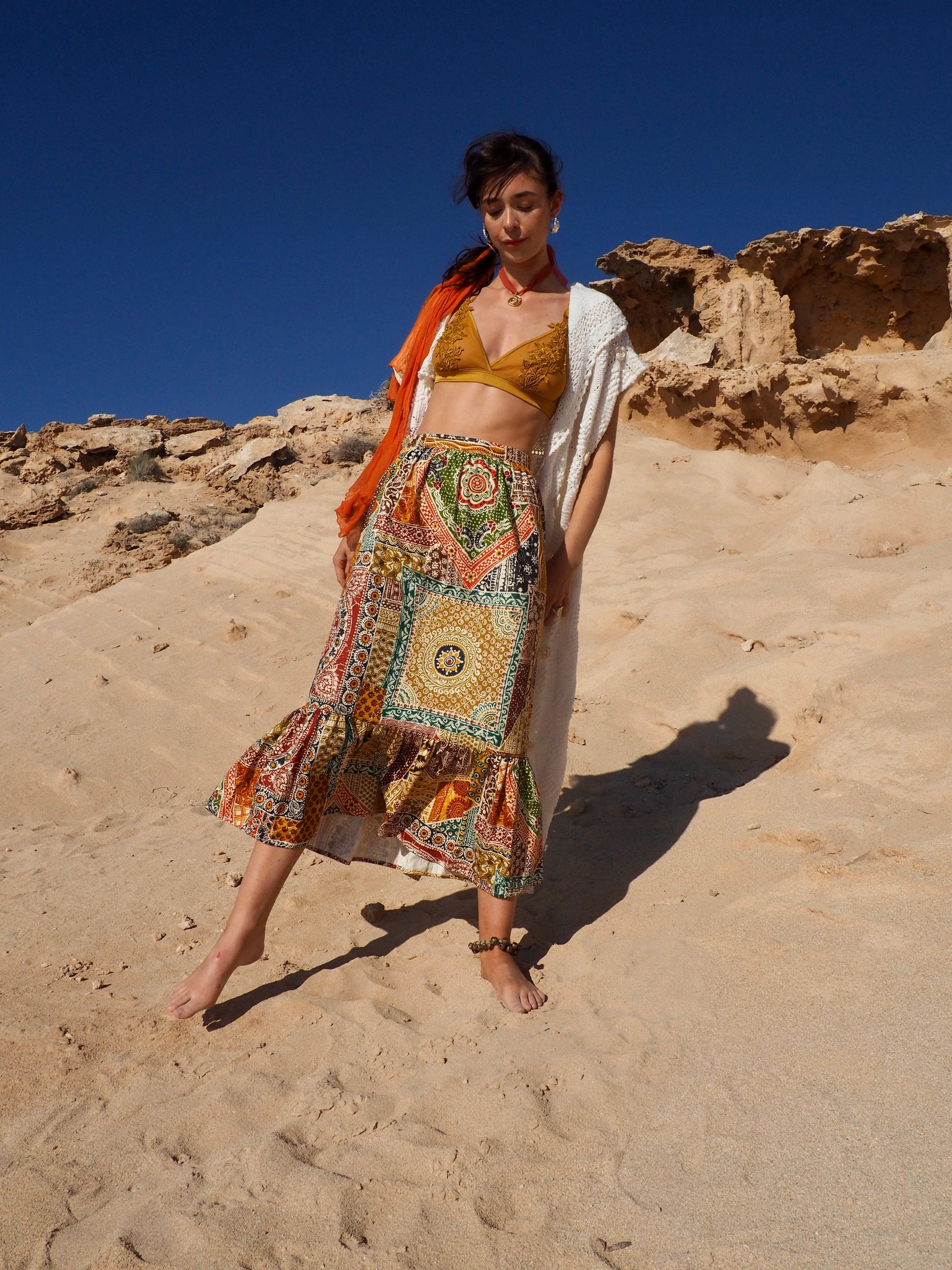 Embrace the spirit of the 1970s with our Vintage Cotton Patchwork Printed Maxi Skirt, a timeless treasure that captures the essence of bohemian style and carefree adventure.