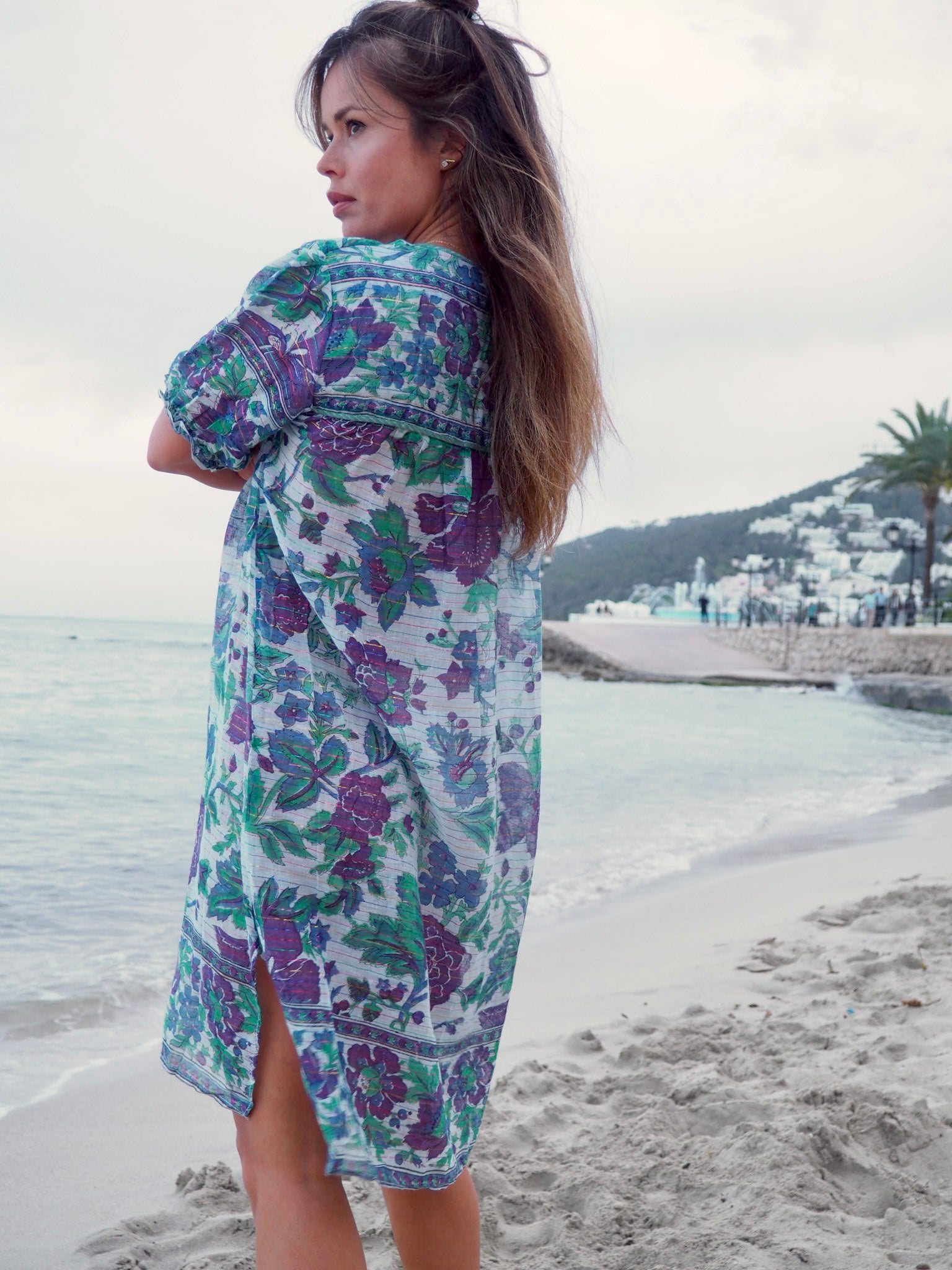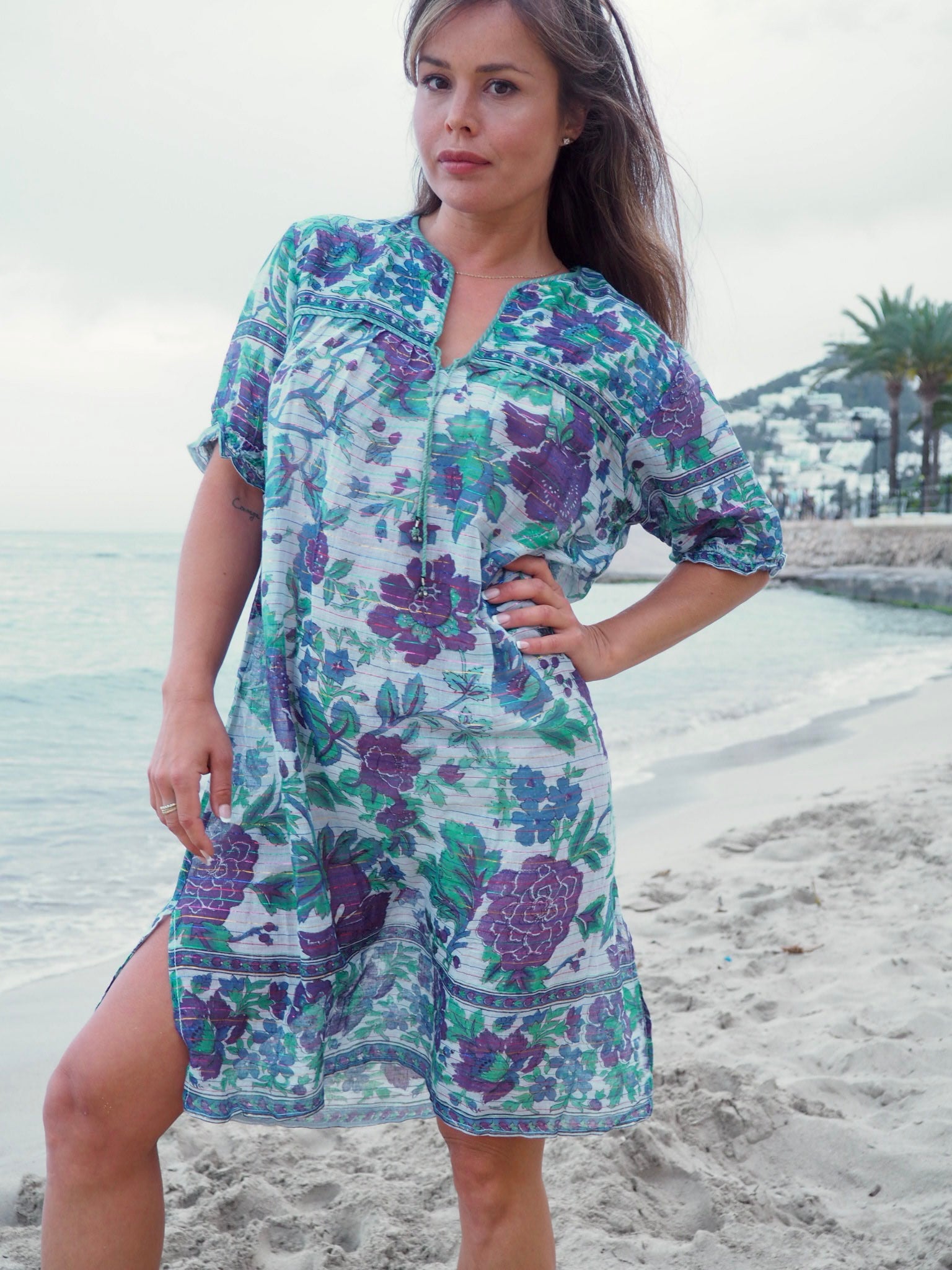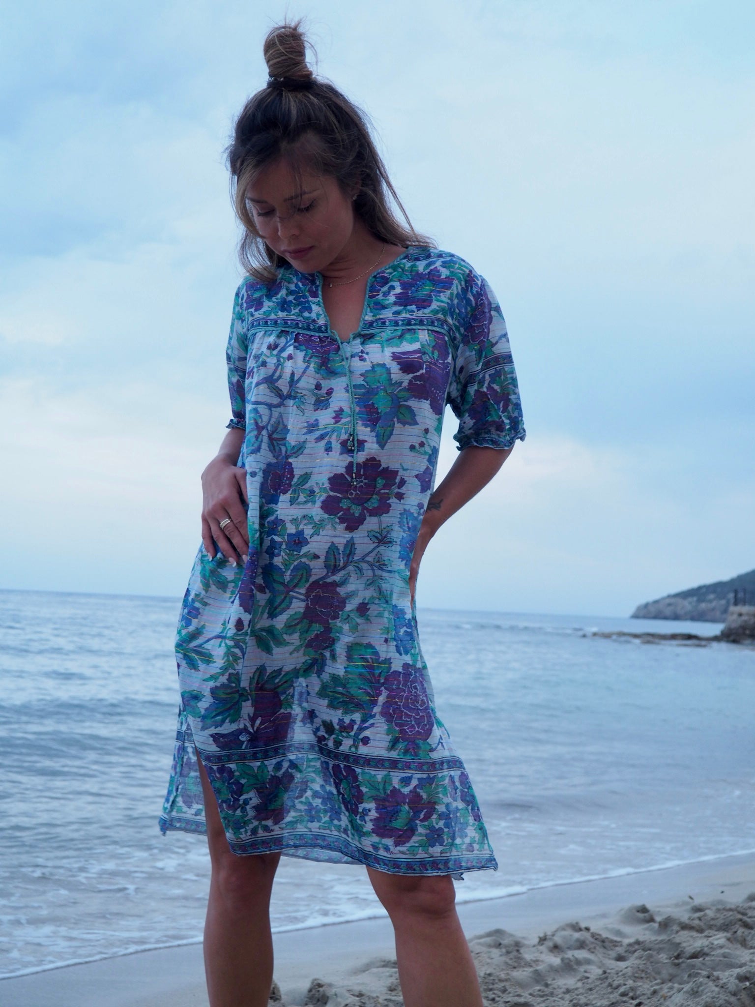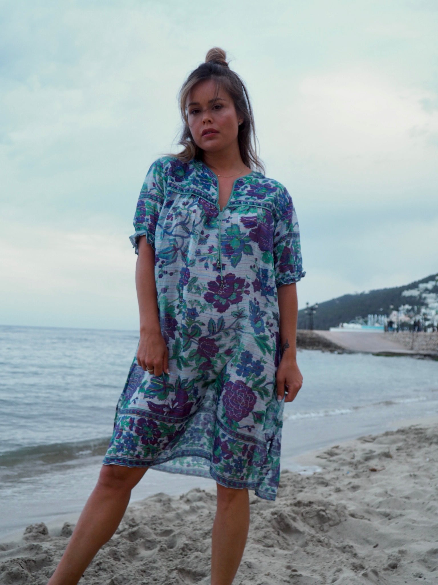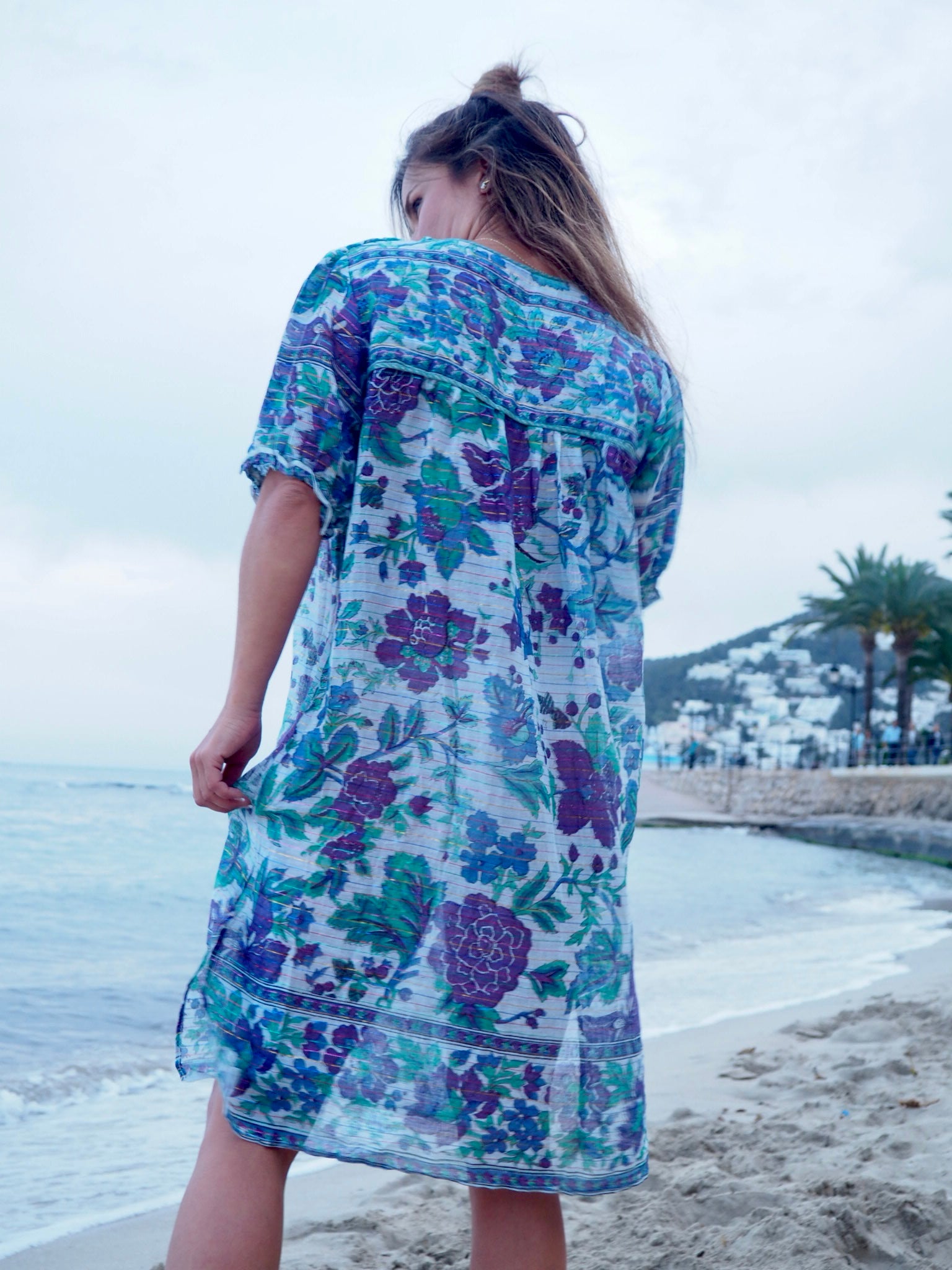 Original vintage 1970’s indian block printed fine cotton gauze dress super thin soft fine cotton fabric traditionally block printed in India useing natural dyes and with a gold thread woven through the cotton for a extra lux feel.