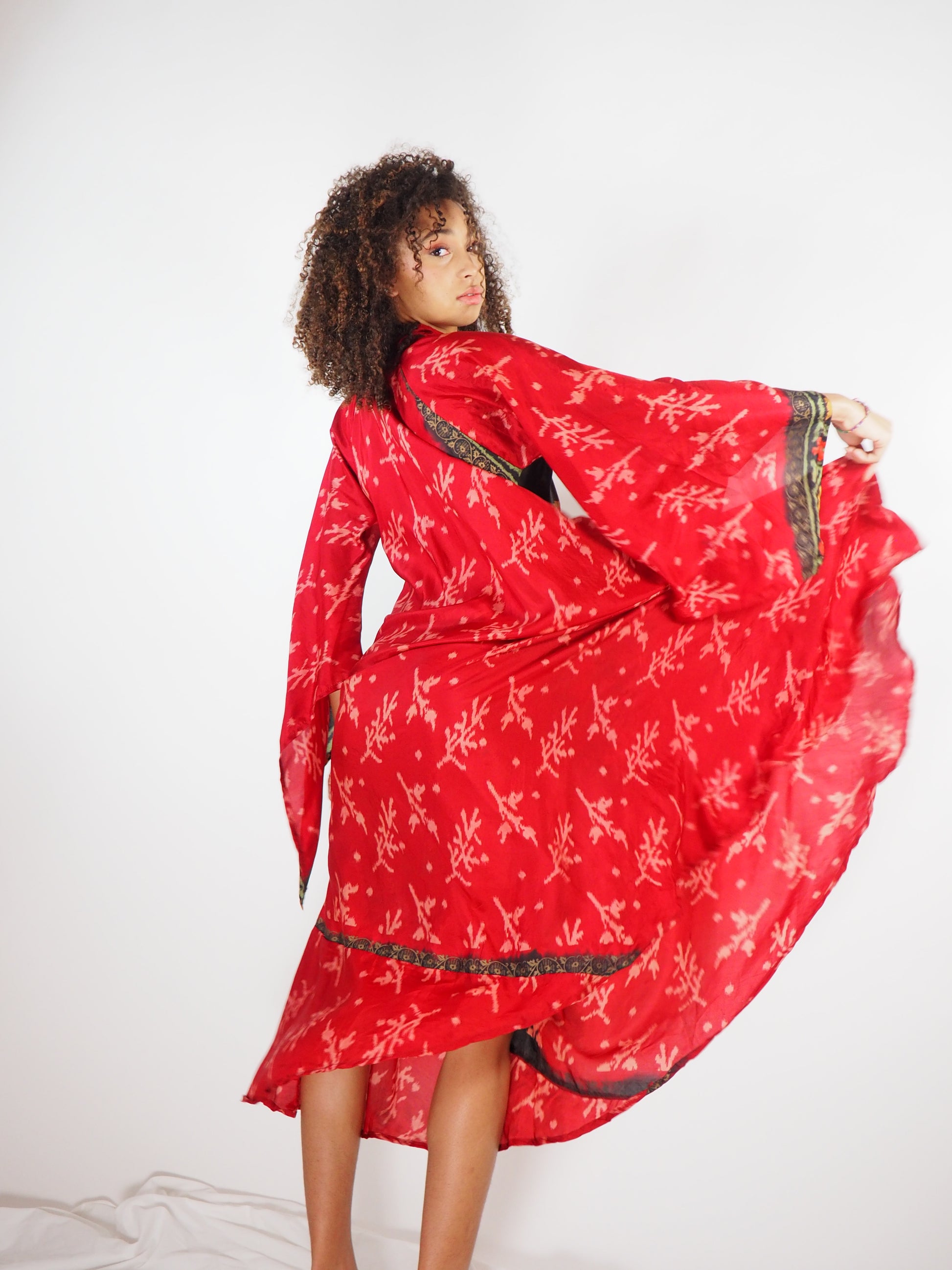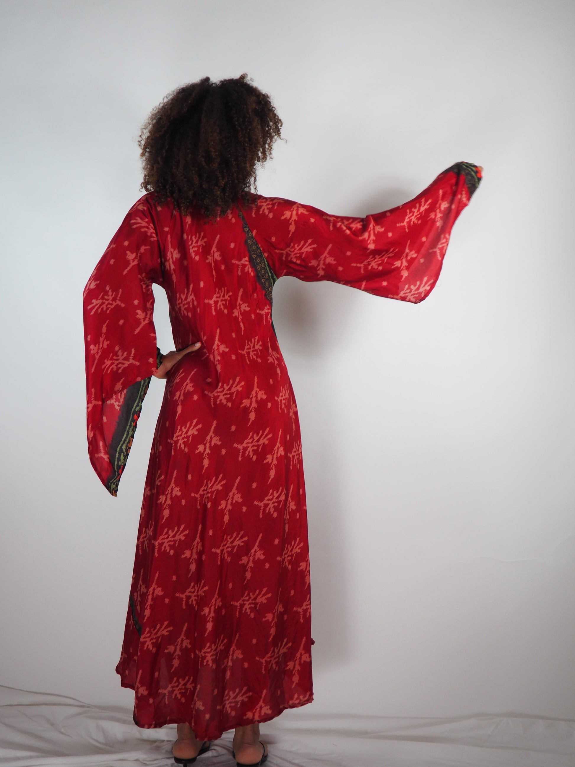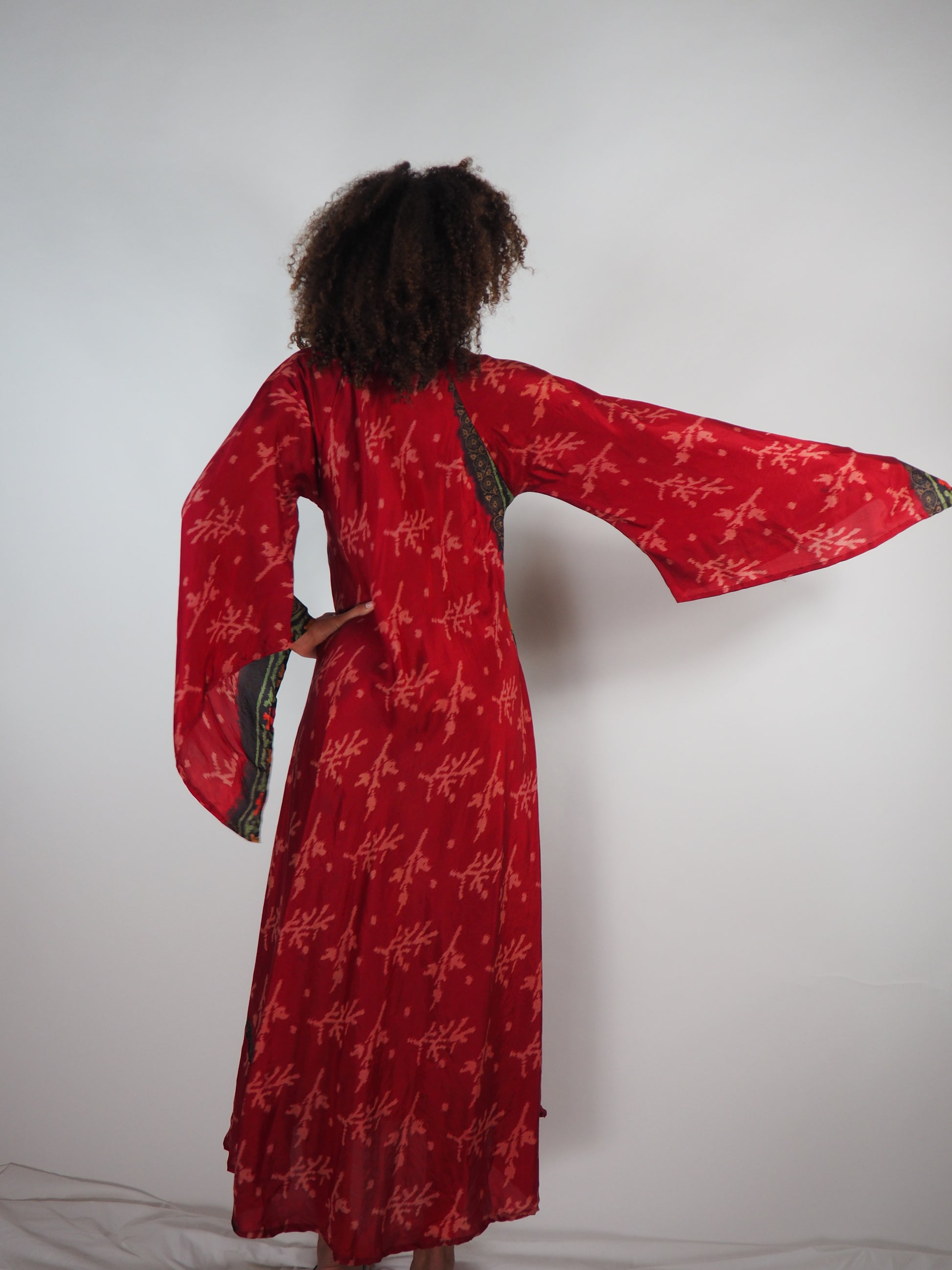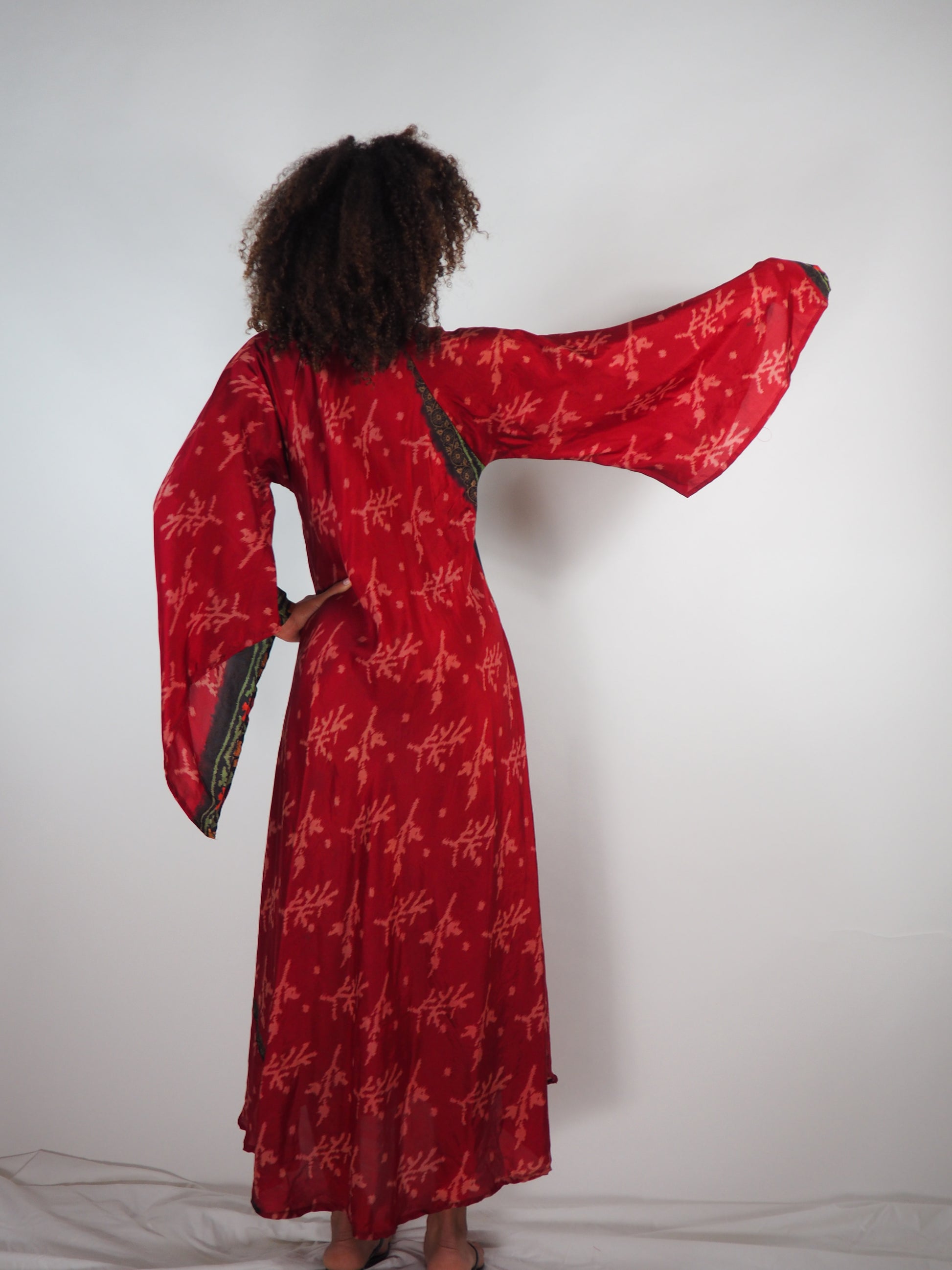 The Diamond Dress is an elegant, full-length bias-cut maxi dress crafted from up-cycled vintage Indian saris. Its flowing silhouette and flattering V-neckline make it a standout piece, while the angel-style batwing sleeves add a touch of bohemian elegance. This dress moves beautifully with every step, making it perfect for special occasions, beach weddings, or effortless summer style.