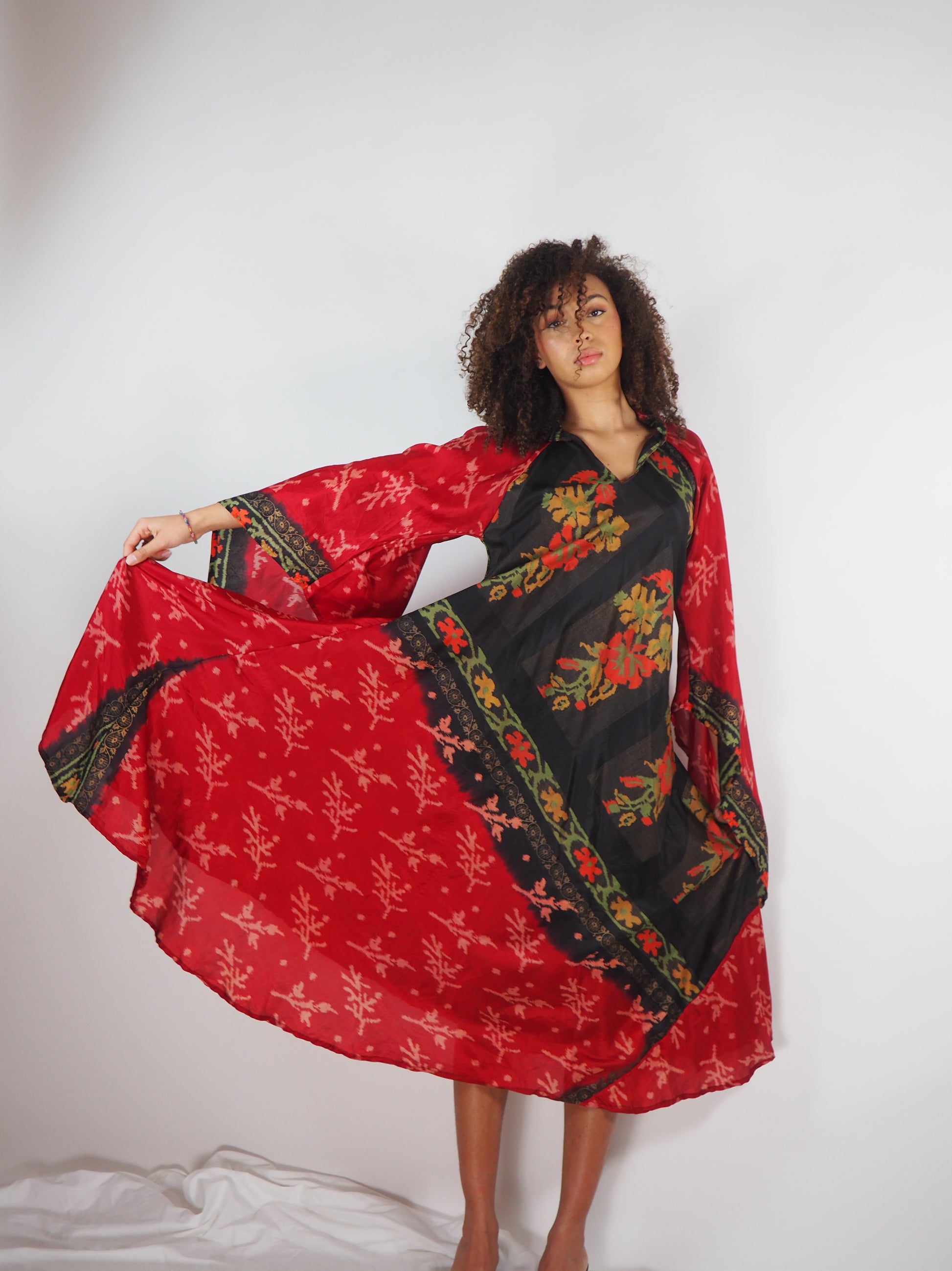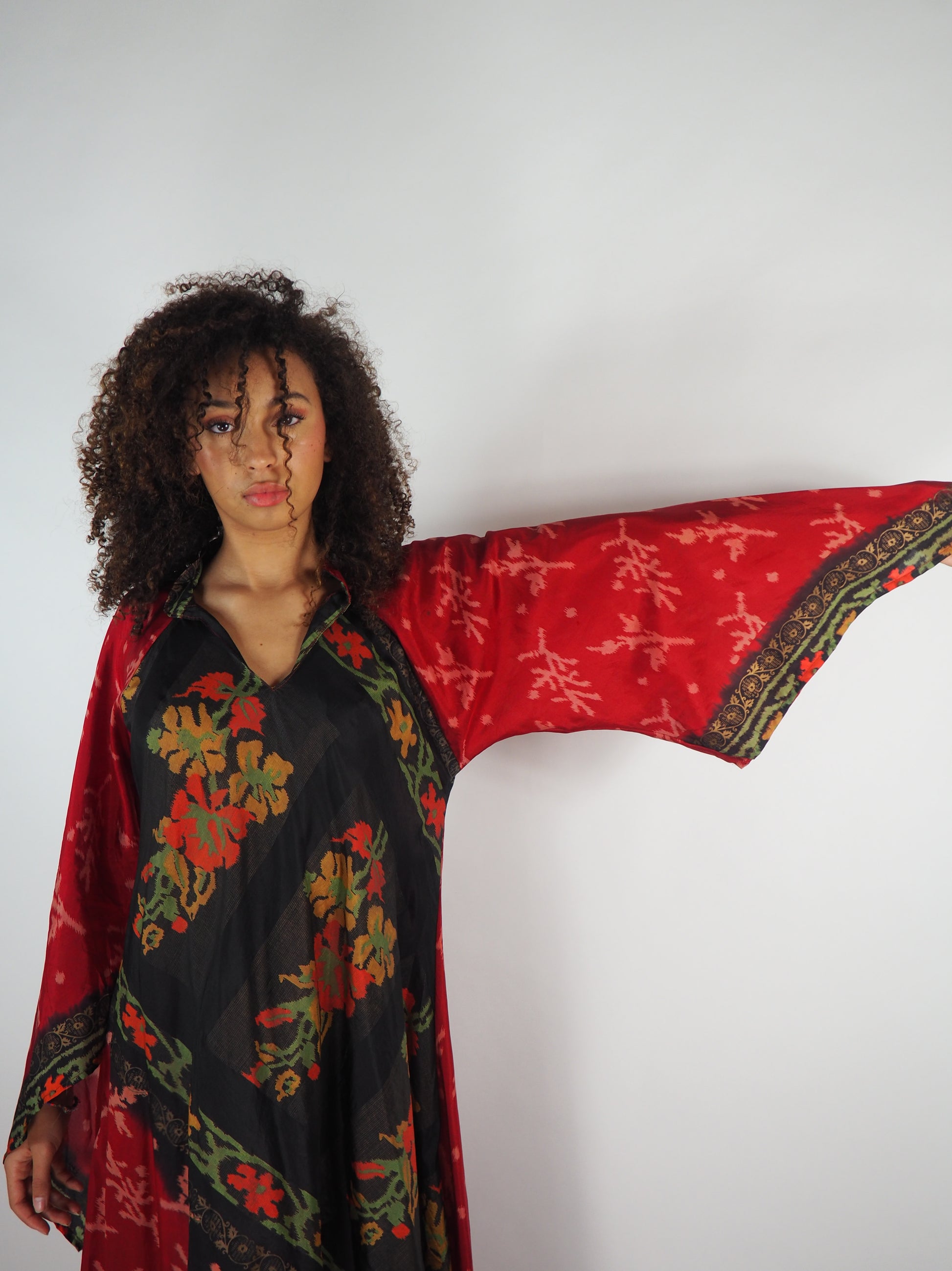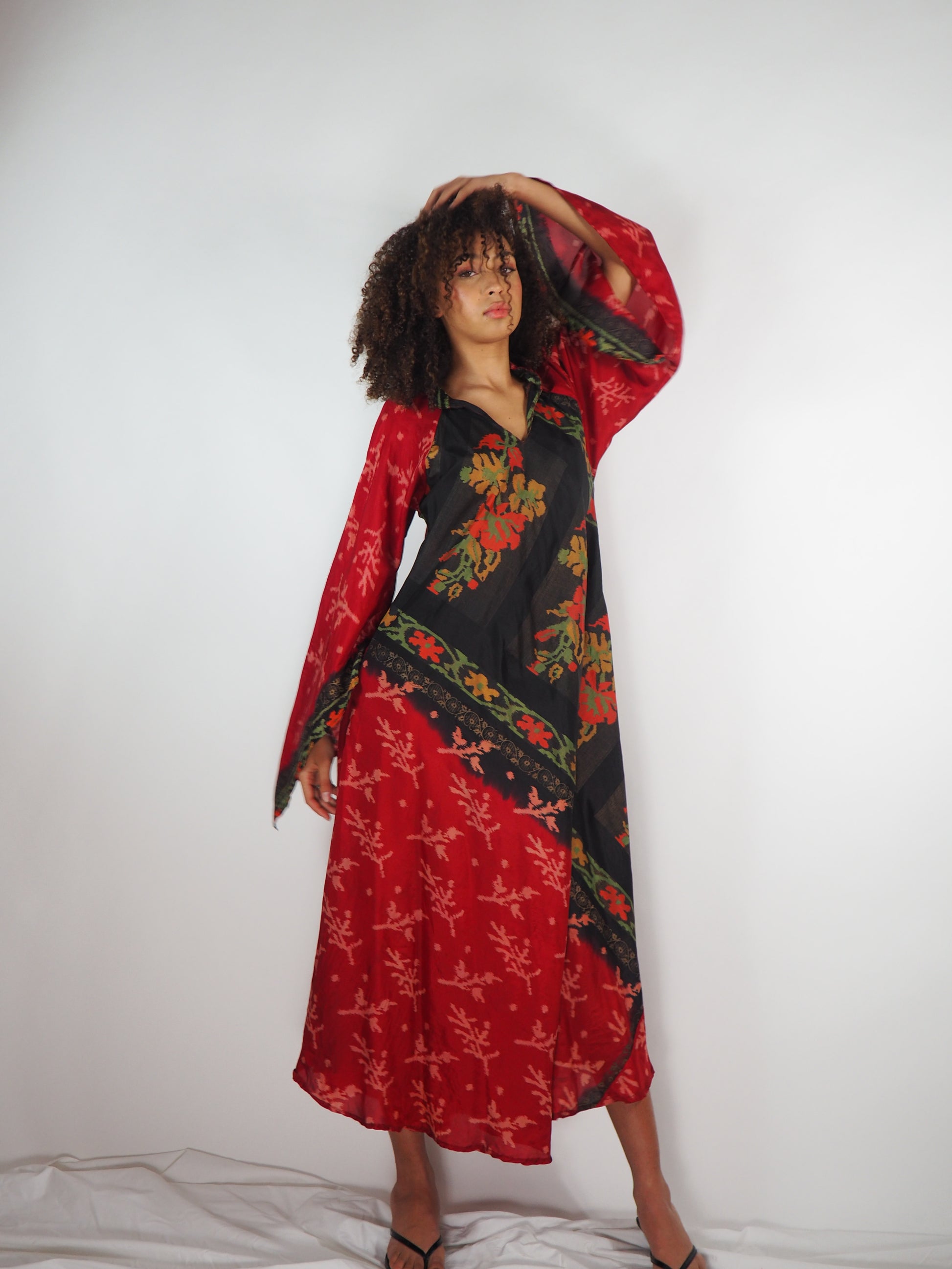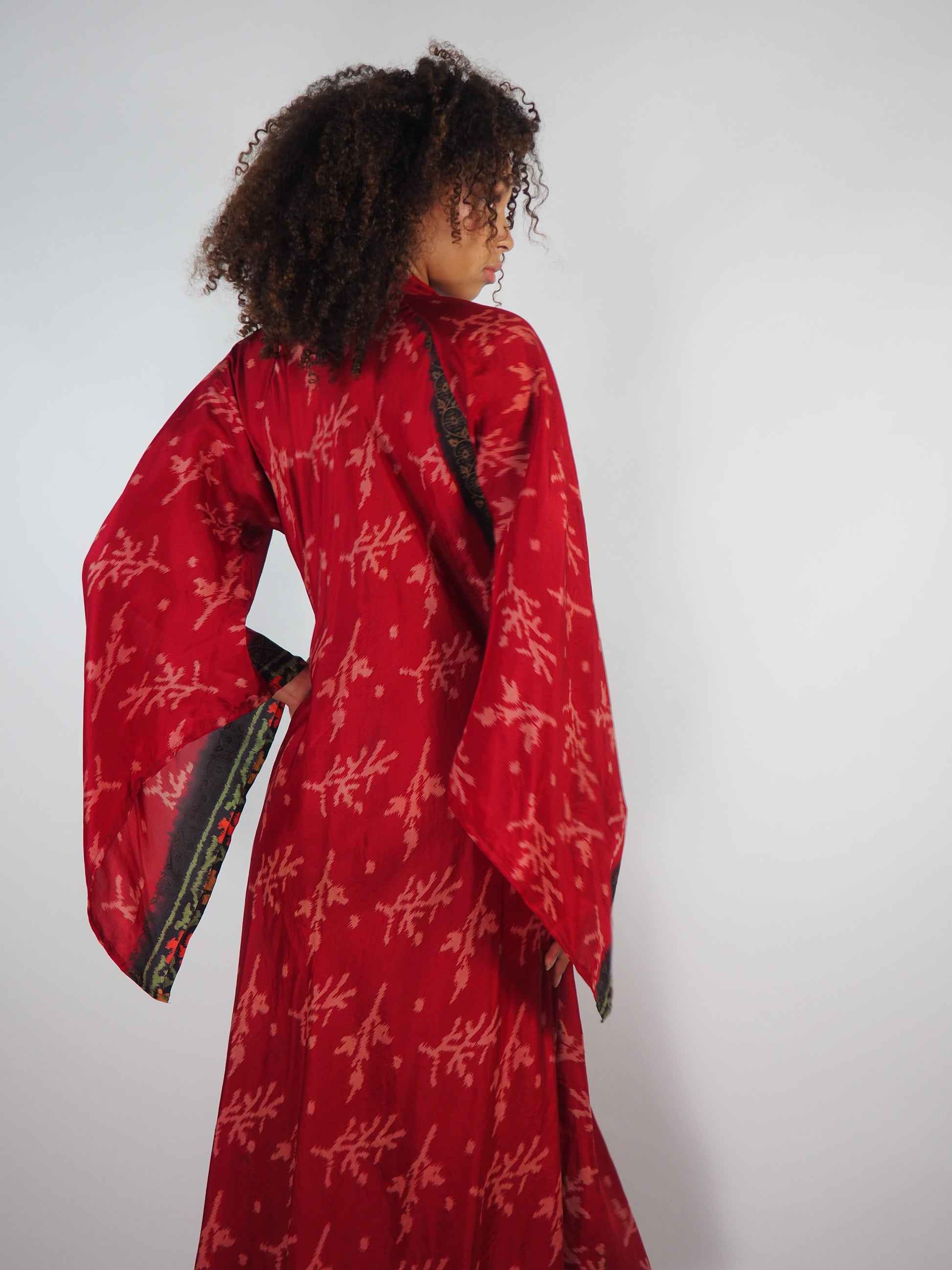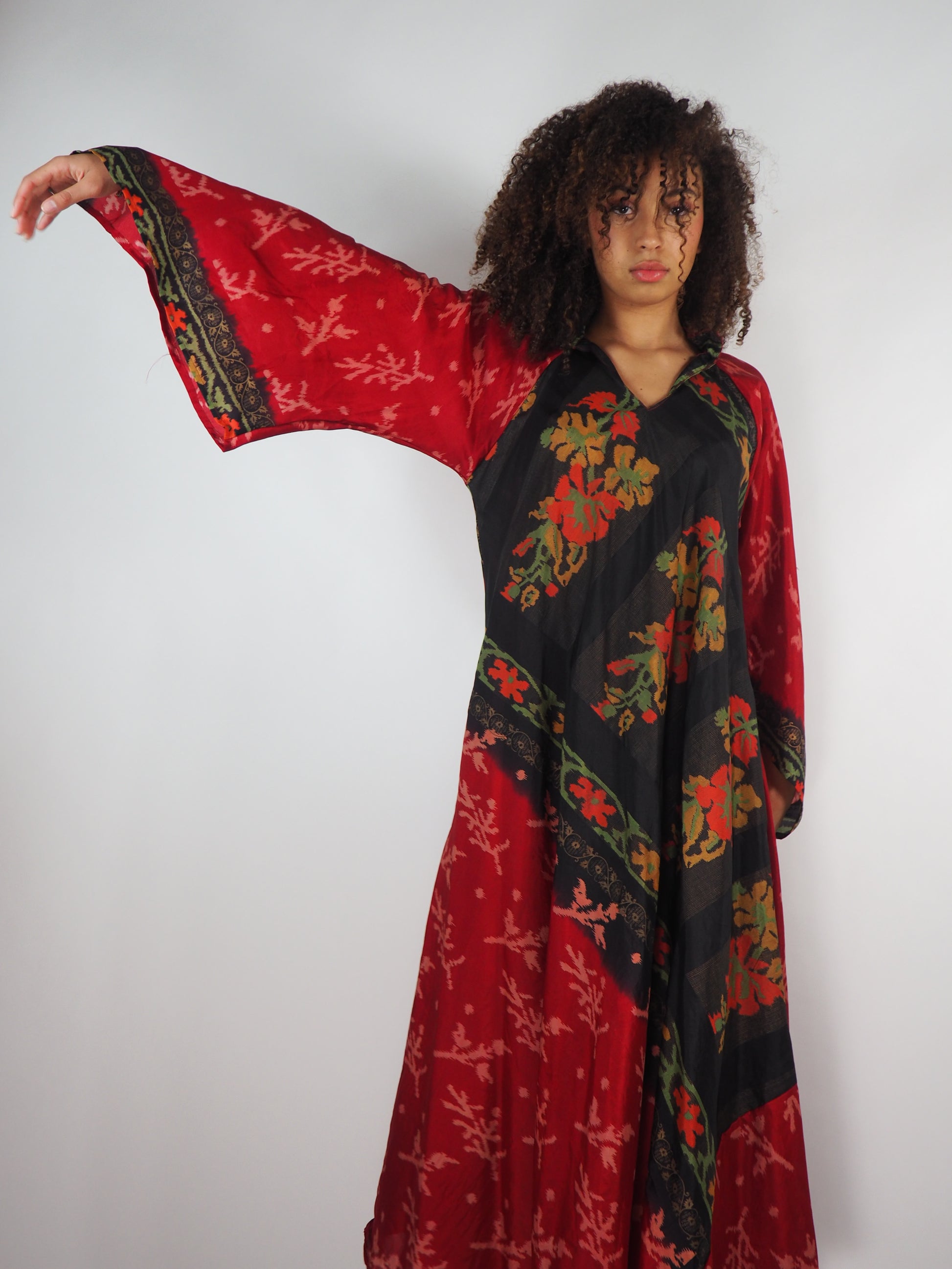 The Diamond Bias-Cut Maxi Dress – Up-cycled Vintage Sari Sustainable Dress with angel Sleeves + Matching Scrunchy & Bag